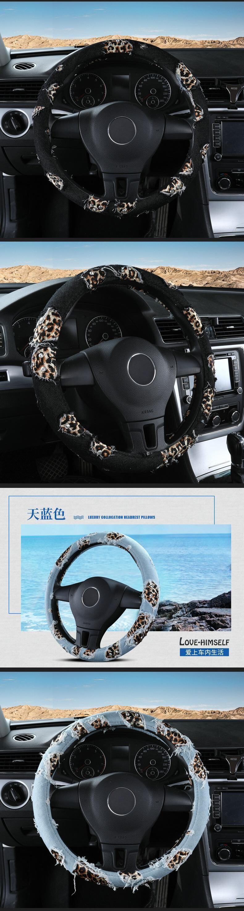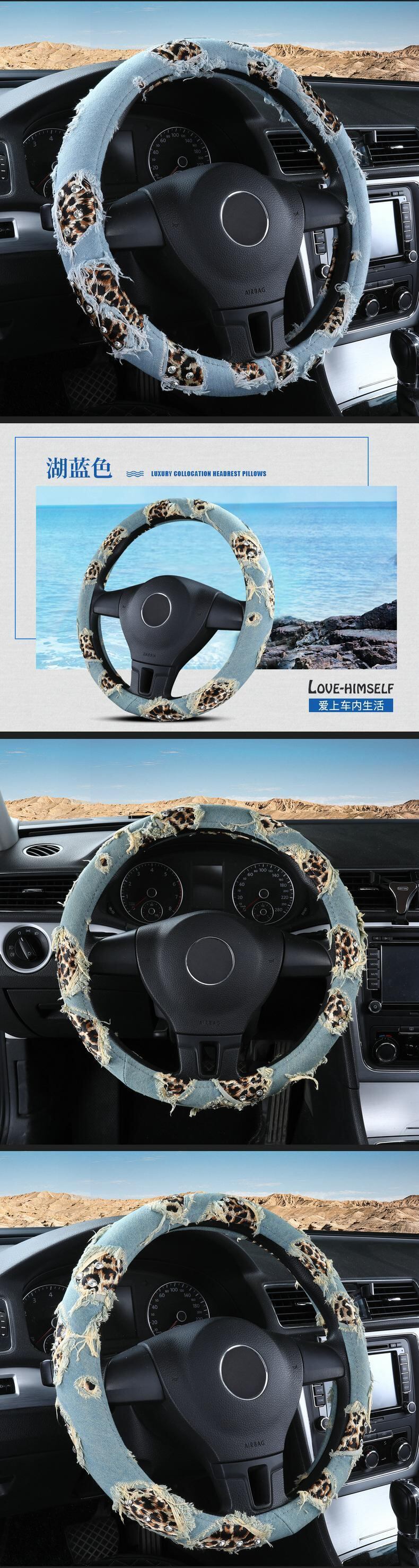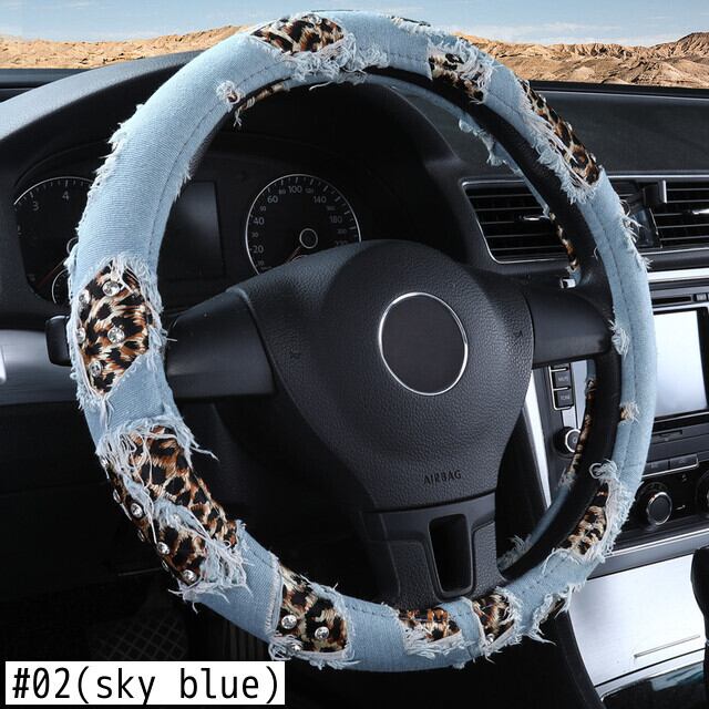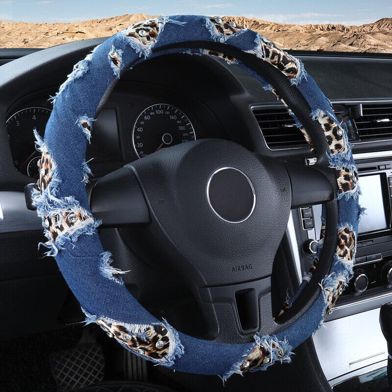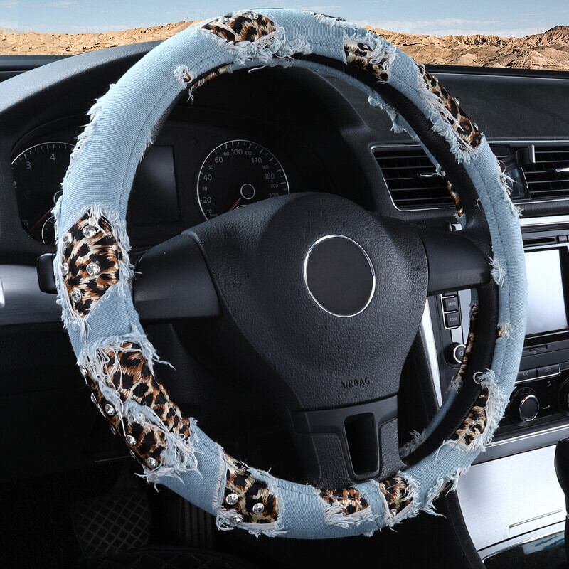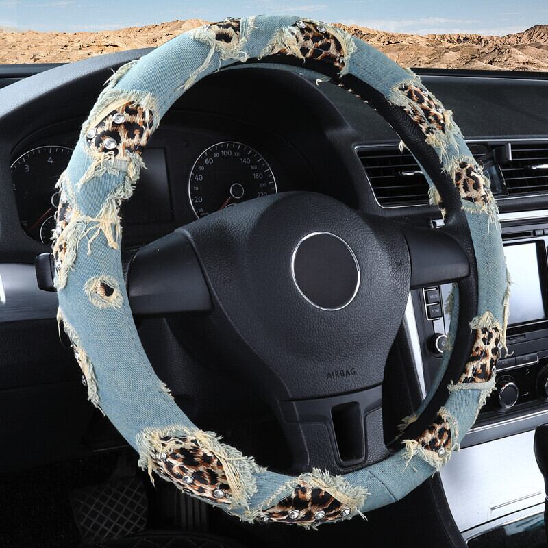 ヒョウデニム車のハンドルカバー 38 センチメートルストリートダイヤモンドカーアクセサリーガールズ装飾女性ユニバーサル | アウトドア キャンプ用品・テントやタープ・シュラフ、マットなどワクワクが止まらない【未来志向ショップ】